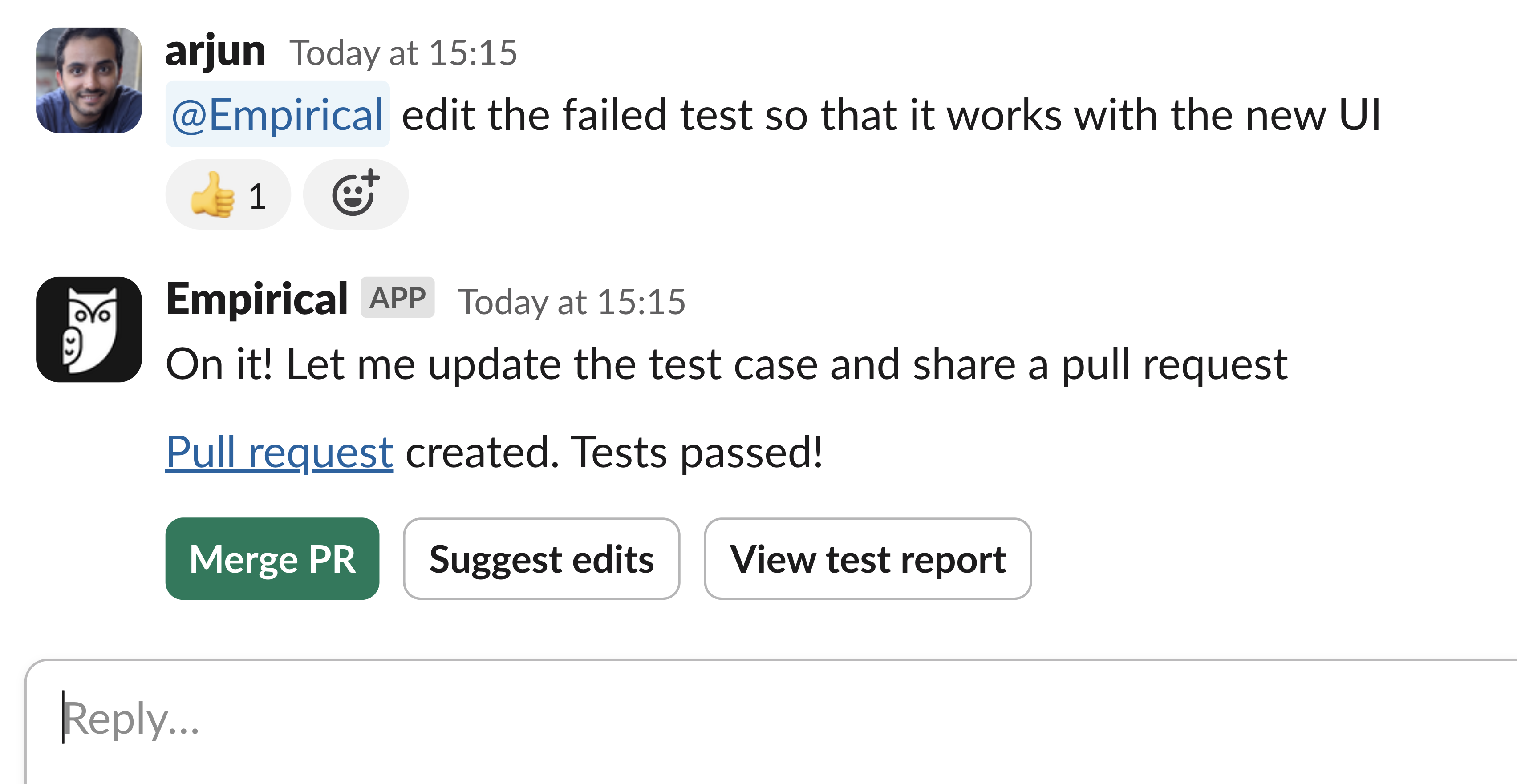 End-to-end tests get stale when new features or UI changes are released. Our AI agents are always ready to rewrite the tests. We review changes and merge them.